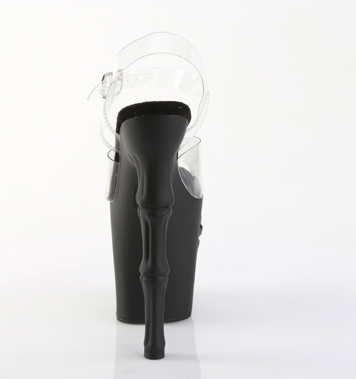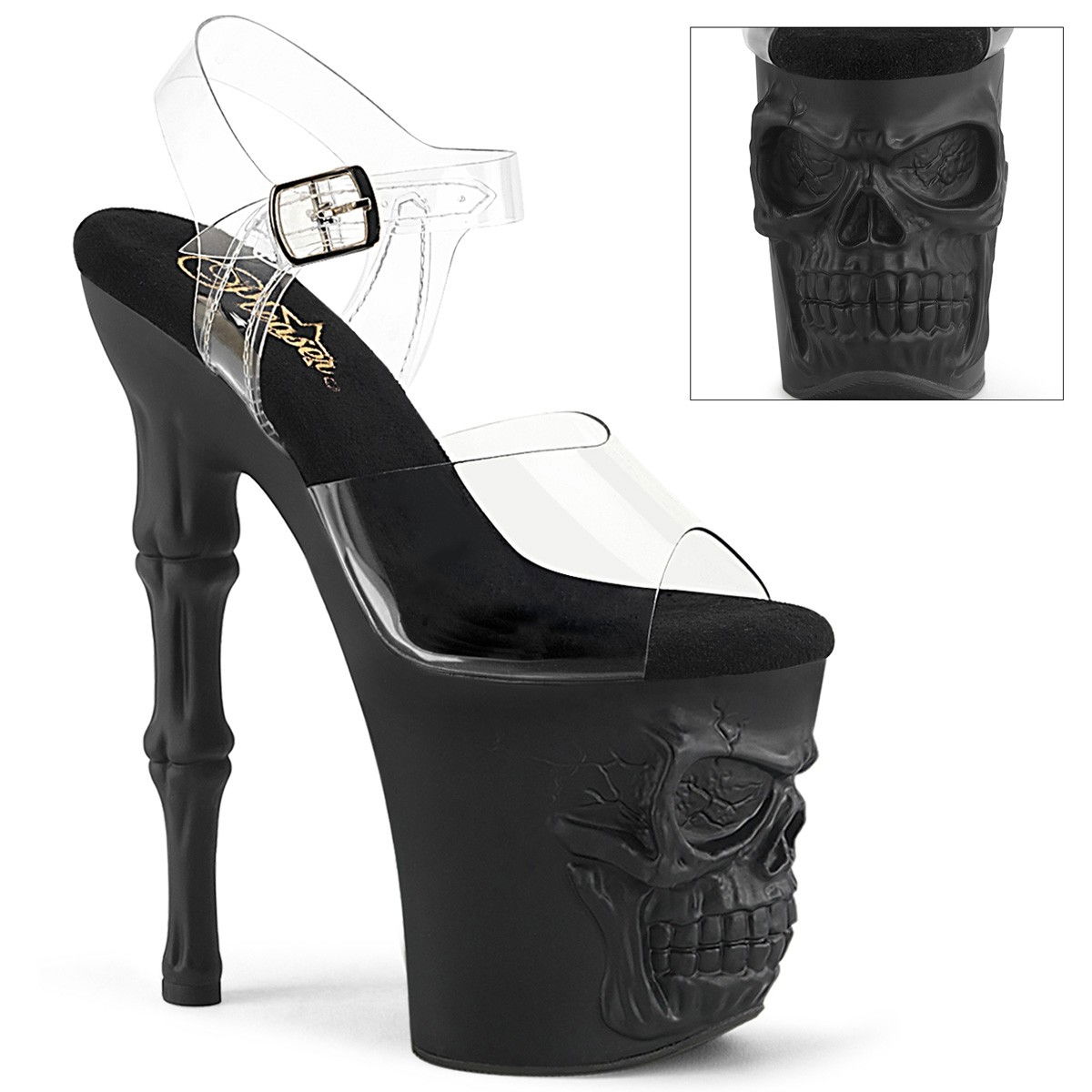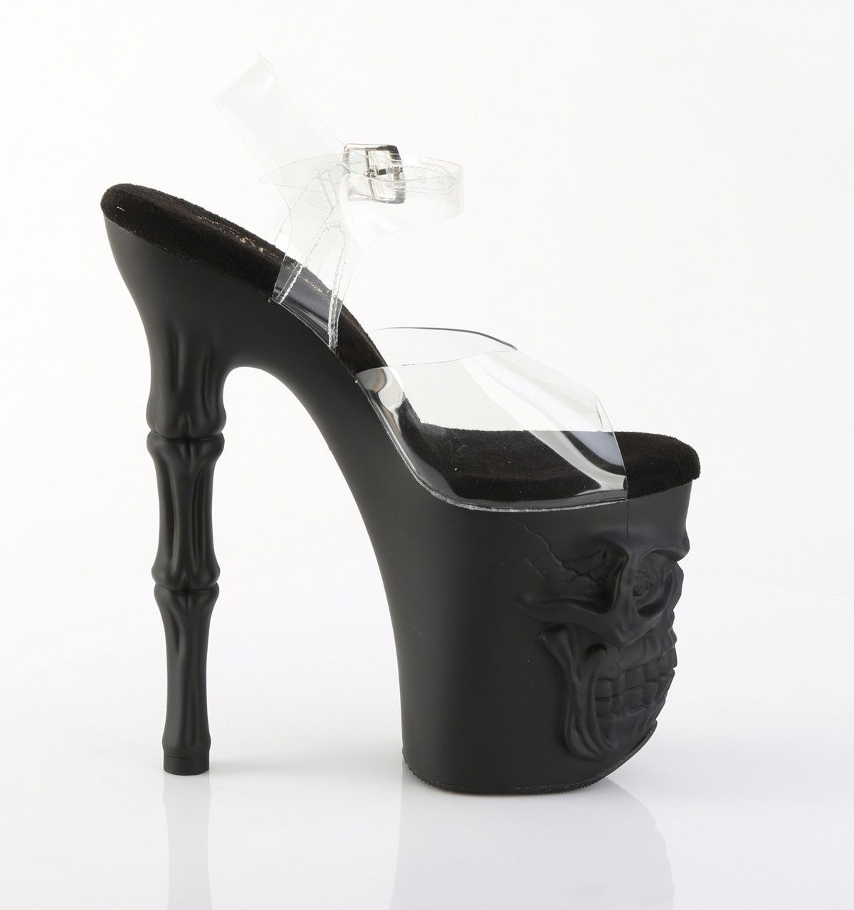 Sandale cu toc inalt de 20 cm, cu platforma inalta, dansatoare. Pe platforma cizmele au sculptat un craniu, iar tocul arata ca oasele