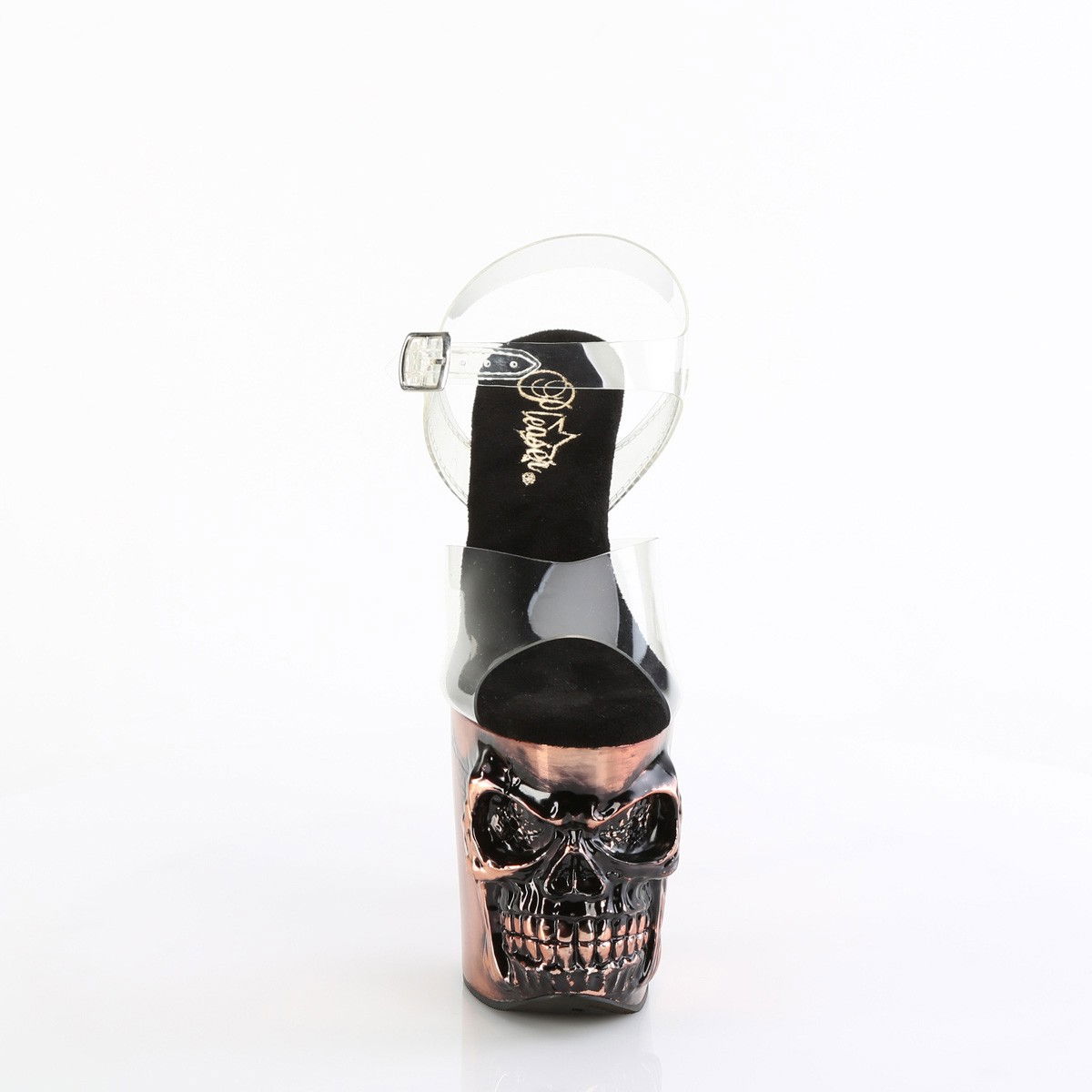 Sandale cu platforma inalta, dansatoare. Pe platforma cizmele au sculptat un craniu, iar tocul arata ca oasele