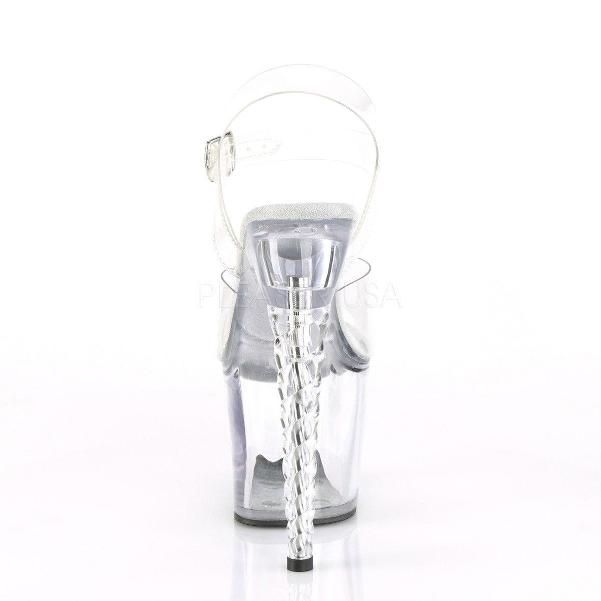 Sandale cu platforma si toc inalt, cu platforma transparenta. Tocul este rasucit. Sandalele sunt cu silicon pe partea superioara. Pe talpa au piele intoarsa. Brand Pleaser