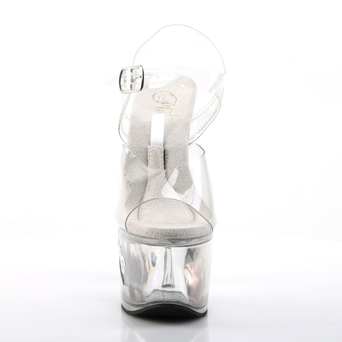 Sandale pentru dansatoare, cu toc inalt si platforma inalta decupata pentru tips, din silicon, cu piele intoarsa pe talpa. Brand Pleaser.