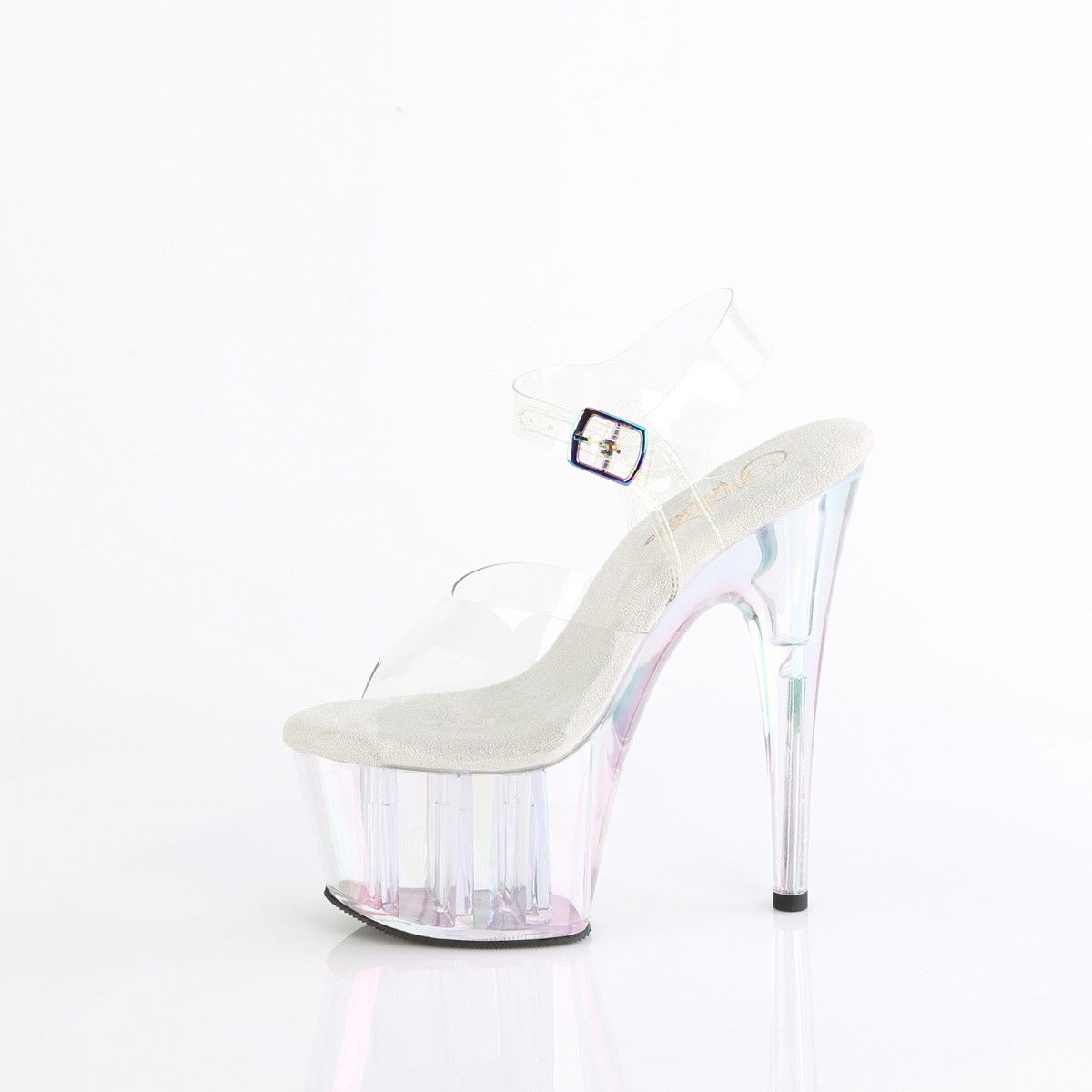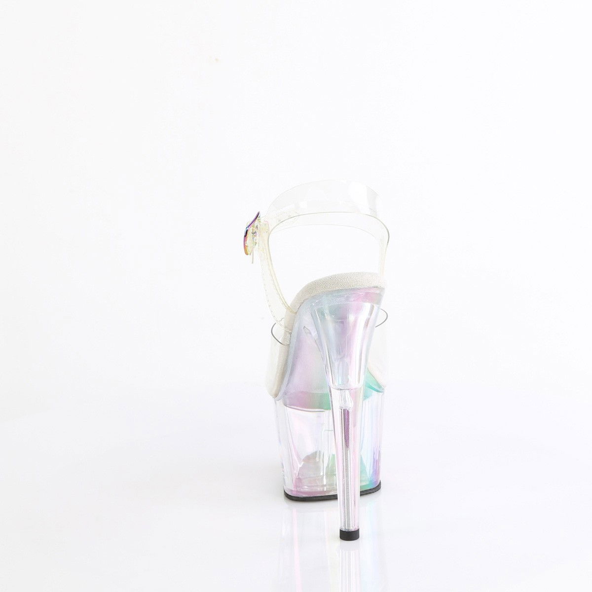 Sandale dansatoare, elegante, cu bareta din silicon si platforma transparenta multicolora, cu piele intoarsa pe talpa. Brand Pleaser.