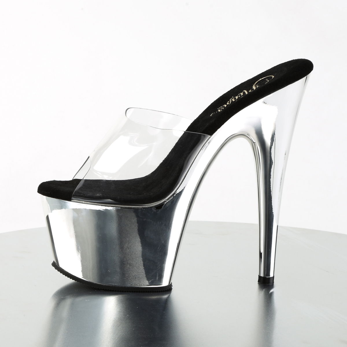 Saboti sexy, senzationali, cu platforma inalta, cu imitatie de piele intoarsa pe talpa. Saboti comozi, de scena, pentru dansatoare si dans la bara. Brand Pleaser USA