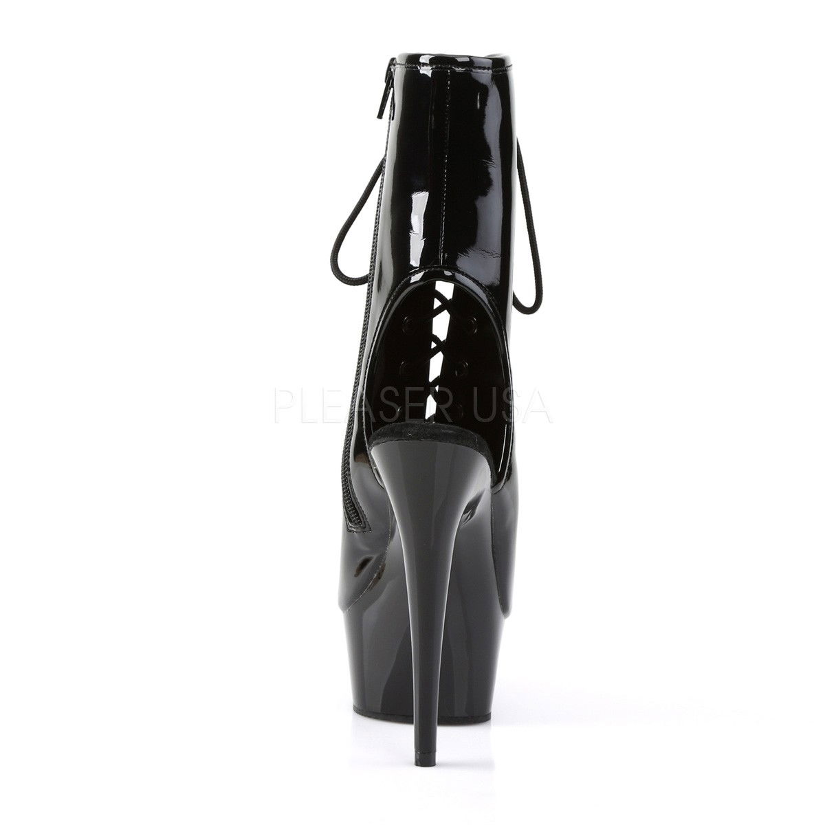 Botine cu toc inalt si platforma medie, cu varful si calcaiul decupate. Botinele au siret in fata, fermoar pe interior si piele intoarsa pe talpa. Botine brand Pleaser