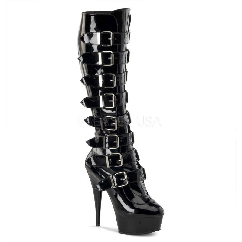 Cizme elegante, sexy, cu platforma, cu catarame pe lateral, negru, lac. Brand Pleaser