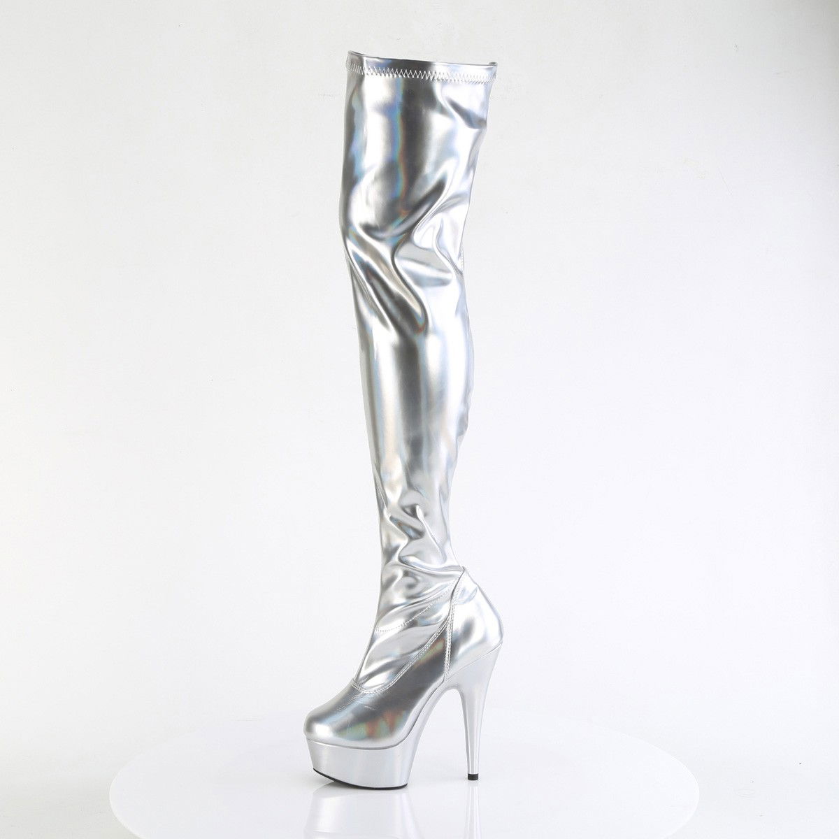 Cizme elegante, sexy, cu platforma, peste genunchi, negru, lac, holograma. Brand Pleaser.