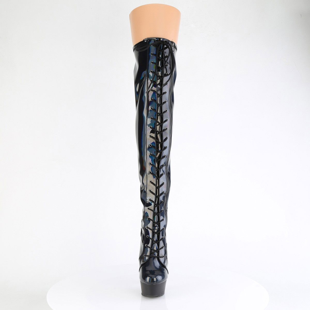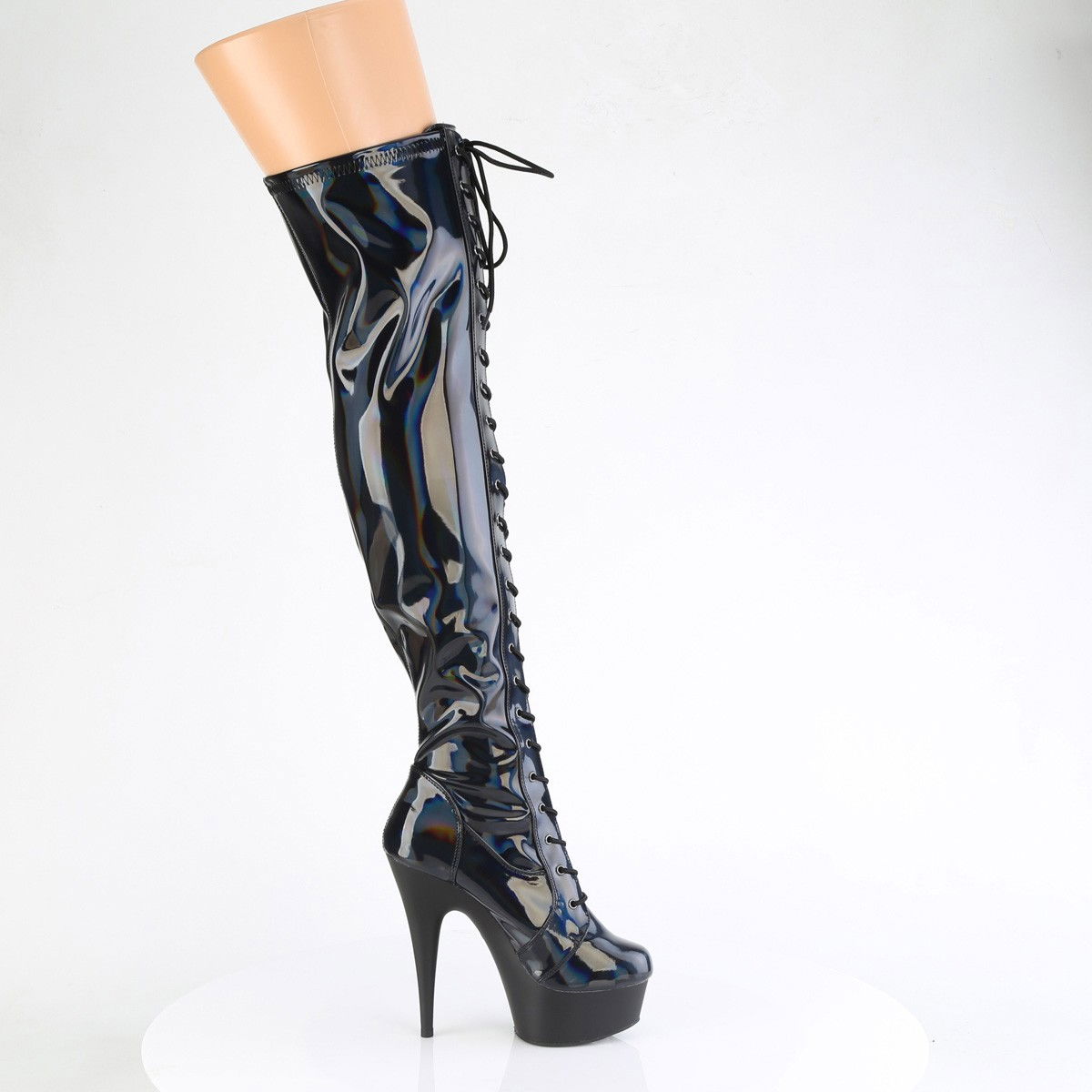 Cizme pentru dansatoare, model holograma, cu toc inalt si platforma medie, cu siret si fermoar pe exterior. Brand Pleaser.