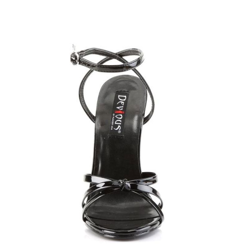 Sandalele Domina 108 sunt sandale elegante cu toc înalt de 15 cm, realizate din lac negru lucios, cu barete subțiri și închidere la gleznă. Modelul oferă un echilibru perfect între feminitate, stabilitate și impact vizual, fiind ideal pentru videochat, apariții de seară pentru profesioniste sau ținute fetish.