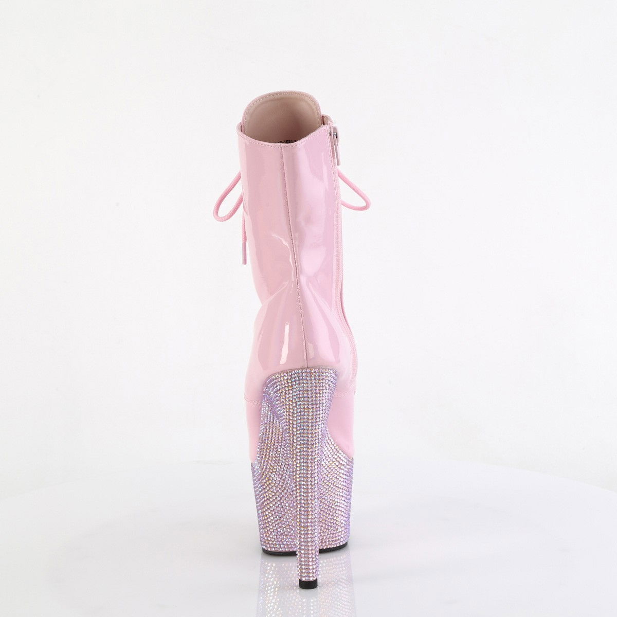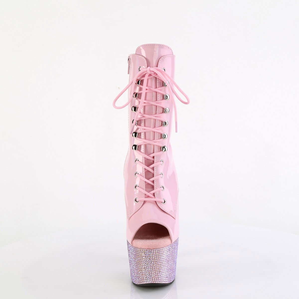 Botine pentru dansatoare pe scena, cu tocul si platforma decorate cu pietricele stralucitoare montate manual, cu varful decupat. Botine roz pentru spectacole de exceptie. Brand Pleaser USA