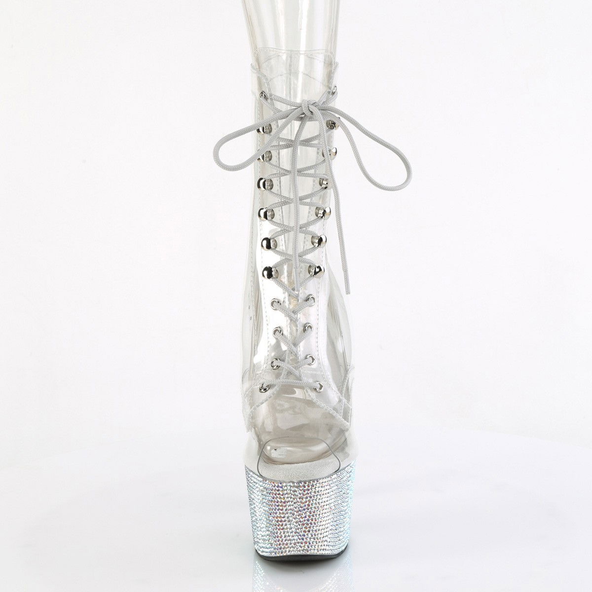 Botine transparente cu tocul si platforma decorate cu pietricele stralucitoare montate manual si cu varful decupat. Botine comode si elegante, pentru spectacole.