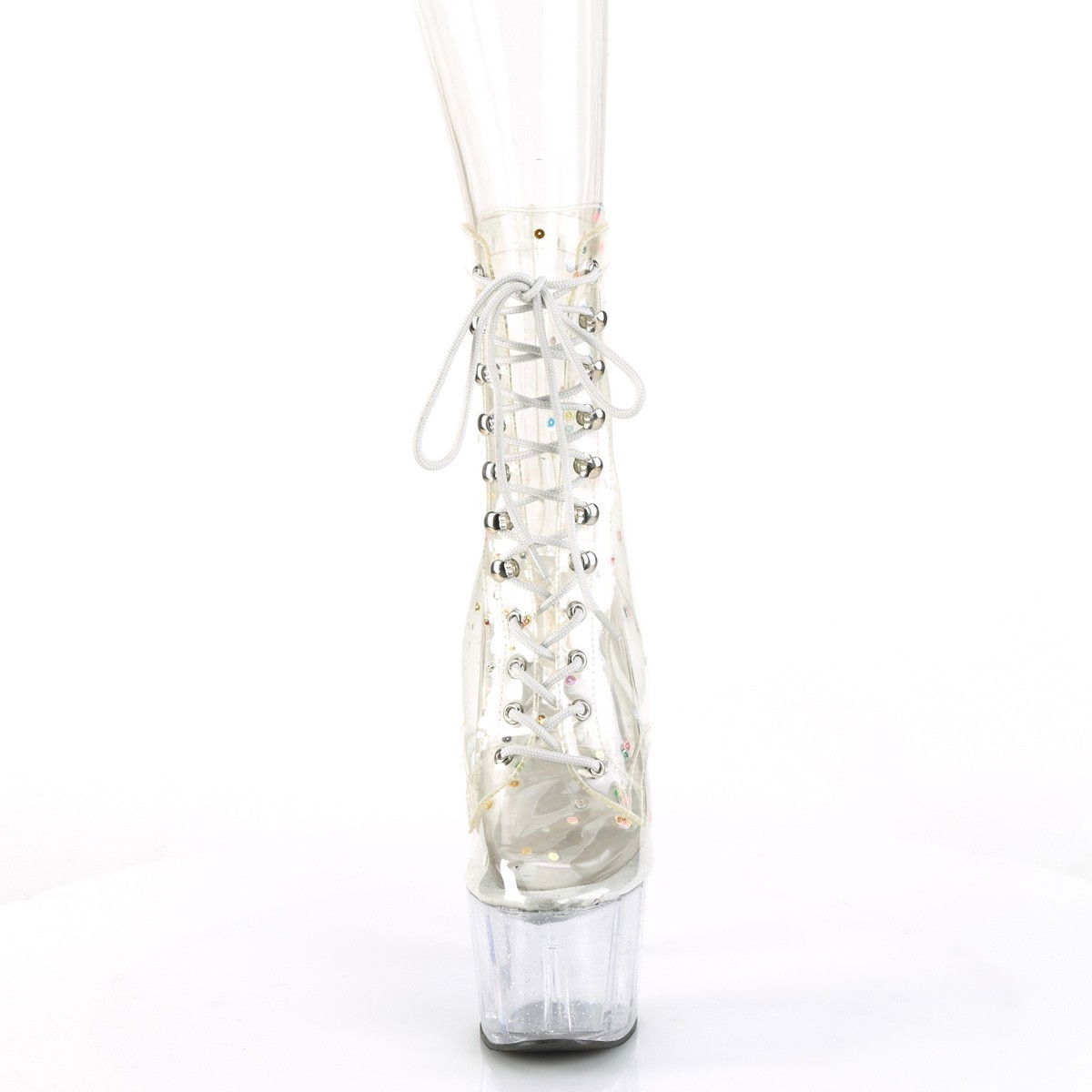 Botine transparente, din silicon, cu platforma transparenta, toc inalt. Botinele au siret in fata, toc de 17.8 cm si platforma de 7 cm. Brand Pleaser