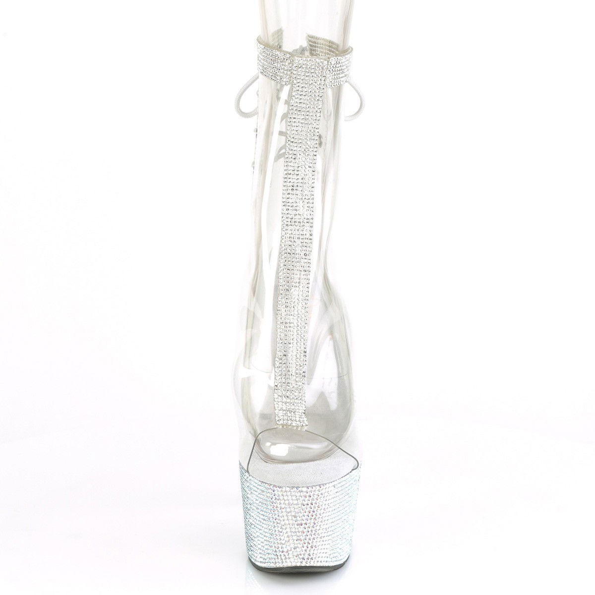 Botine cu toc inalt si cu platforma decorate cu pietricele stralucitoare. Botine transparente comode, cu piele intoarsa ecologica pe talpa. Brand Pleaser USA