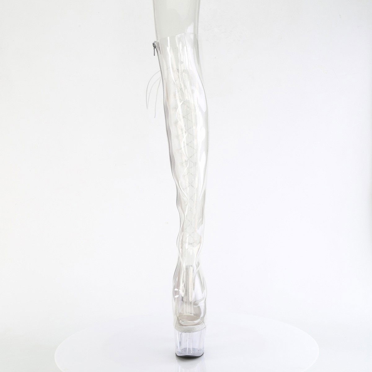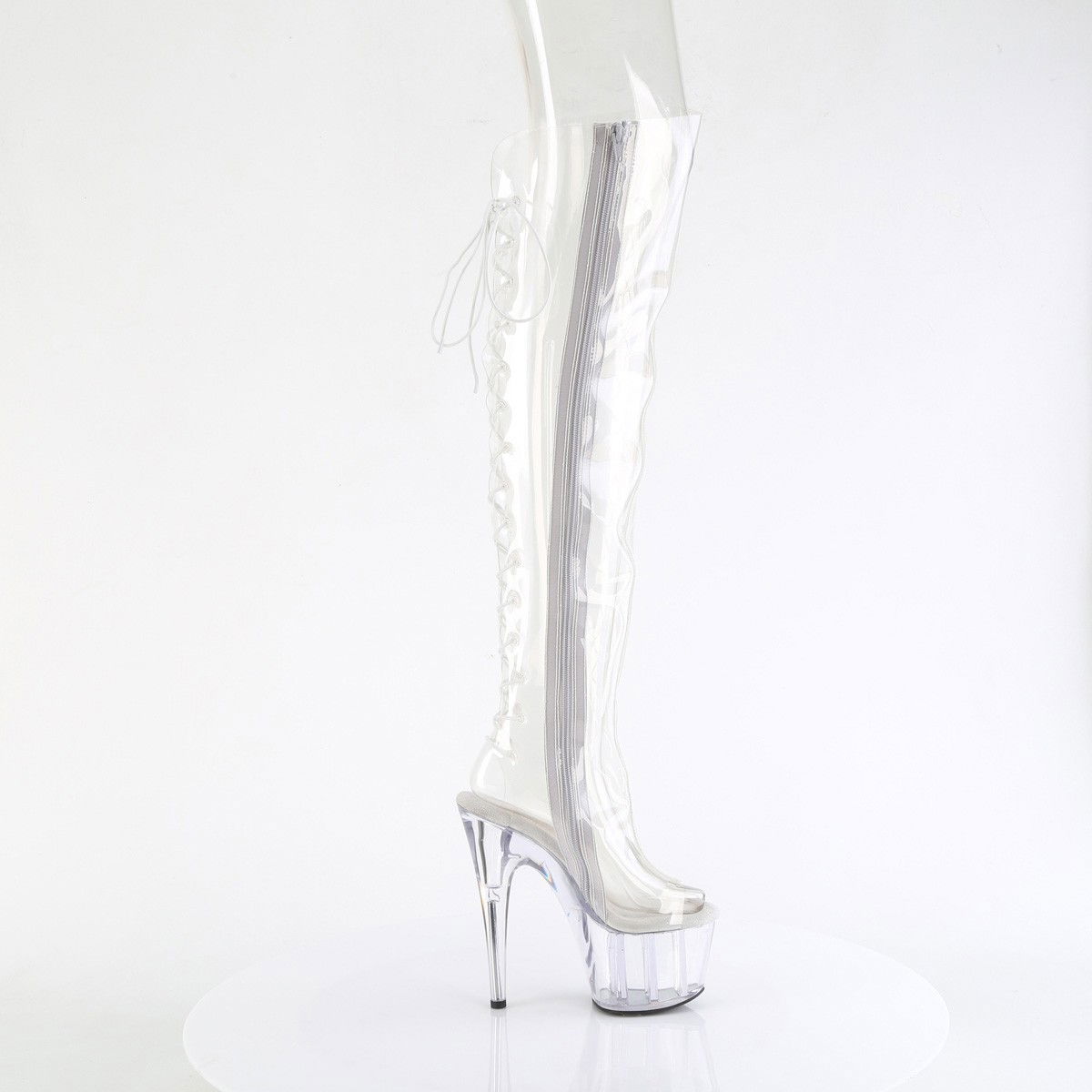 Cizme peste genunchi, cu varful si calcaiul decupate, cu siret la spate si fermoar pe interior. Cizmele sunt transparente, din silicon. Cizme de club, cu platforma inalta si toc inalt