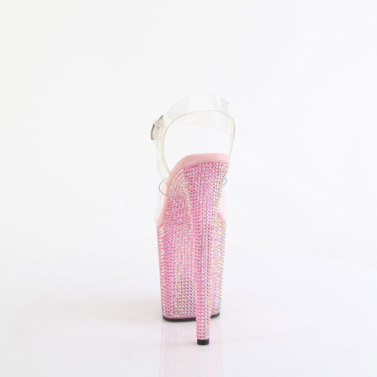 Sandale pentru dansatoare, cu toc inalt si platforma inalta decorate cu pietricele stralucitoare. Sandalele au piele intoarsa pe talpa pentru ca piciorul sa nu transpire. Brand Pleaser.