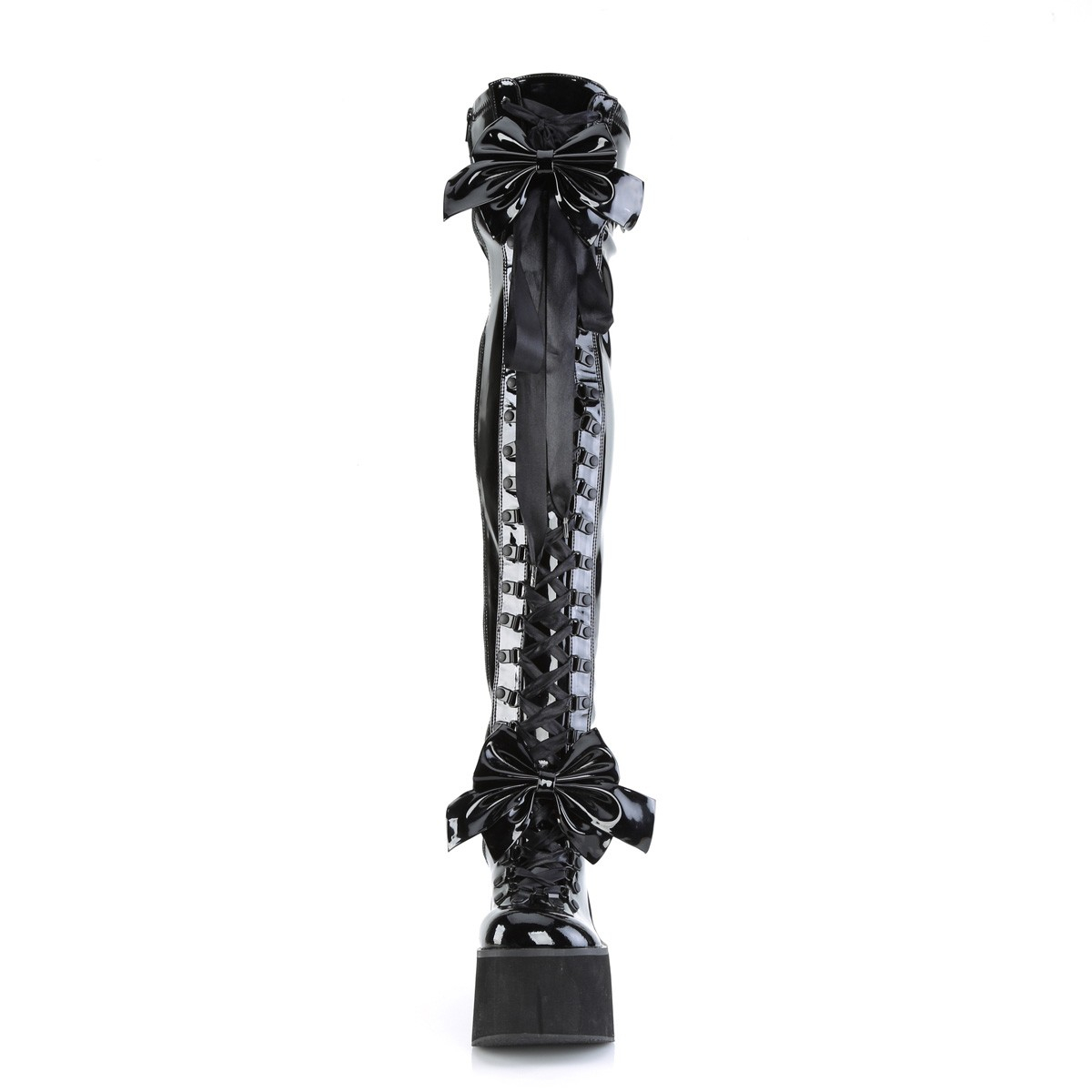 Cizme peste genunchi cu platforma inalta, fara toc, cu siret in fata si o catarama si doua funde mari, fermoar pe interiorul piciorului, stil gotic, din piele ecologica lacuita. Brand Demonia