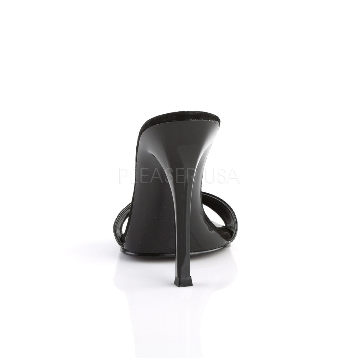 Saboti eleganti, sexy, negru lac. Producatorul Pleaser USA nu da nici o valoare pentru platforma si au toc de 11,47 cm. Pe talpa este piele intoarsa pentru ca piciorul sa nu transpire si sa alunece.
