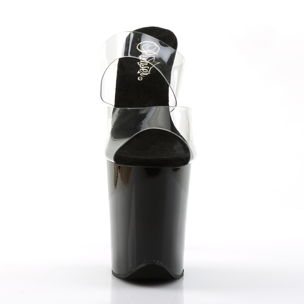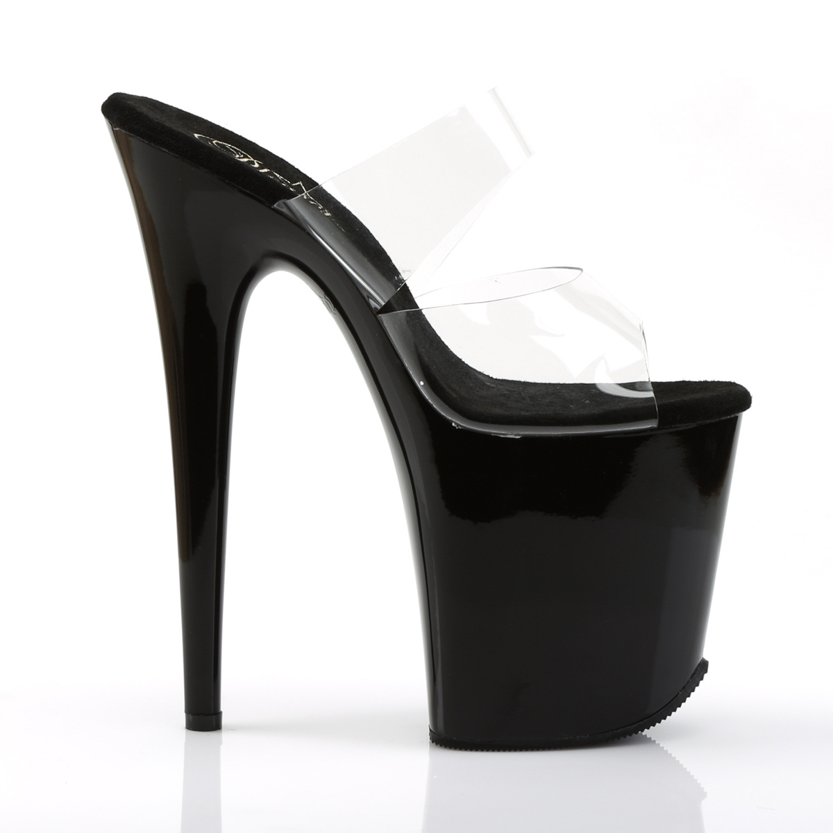 Saboți sexy, de scenă, cu platformă înaltă de 10 cm și toc de 20 cm, cu barete din silicon transparent. Acești saboți sunt alegerea perfectă pentru pole dance, dans la bară în club sau show-uri profesionale, oferind un look ultra-sexy și o alungire spectaculoasă a piciorului. Brand Pleaser USA.